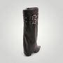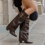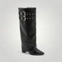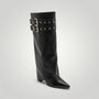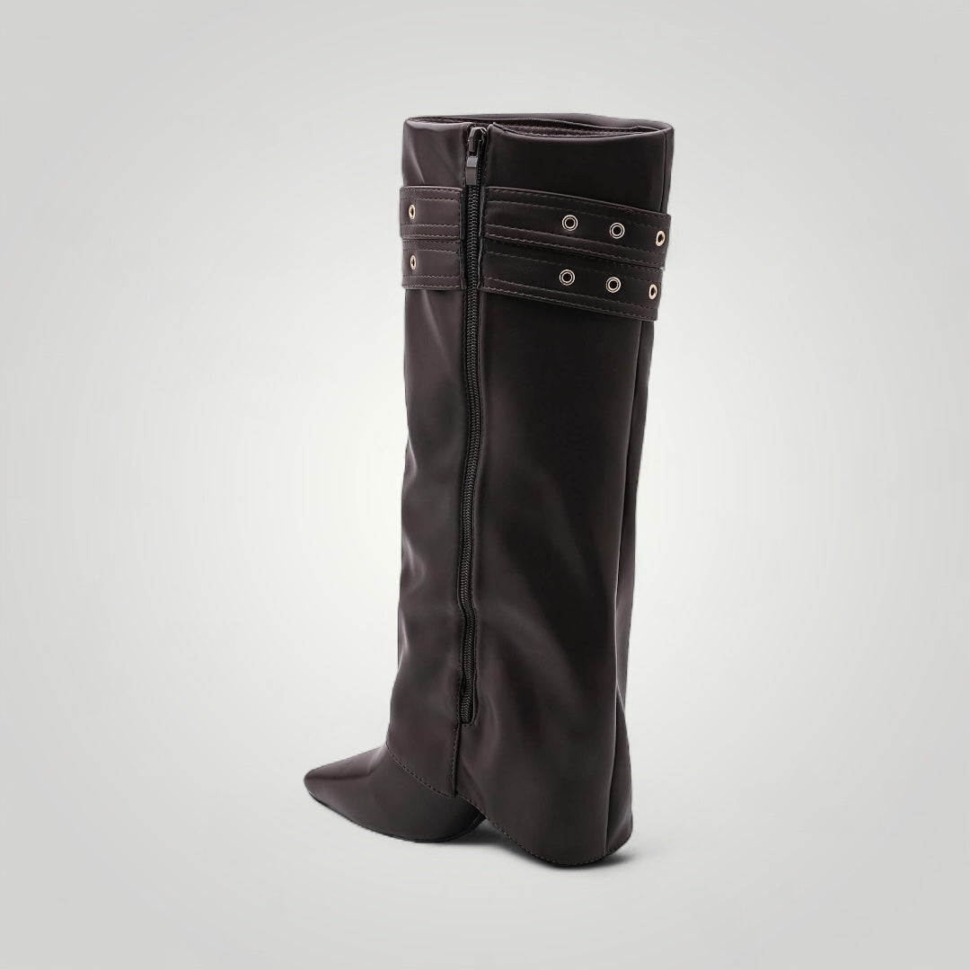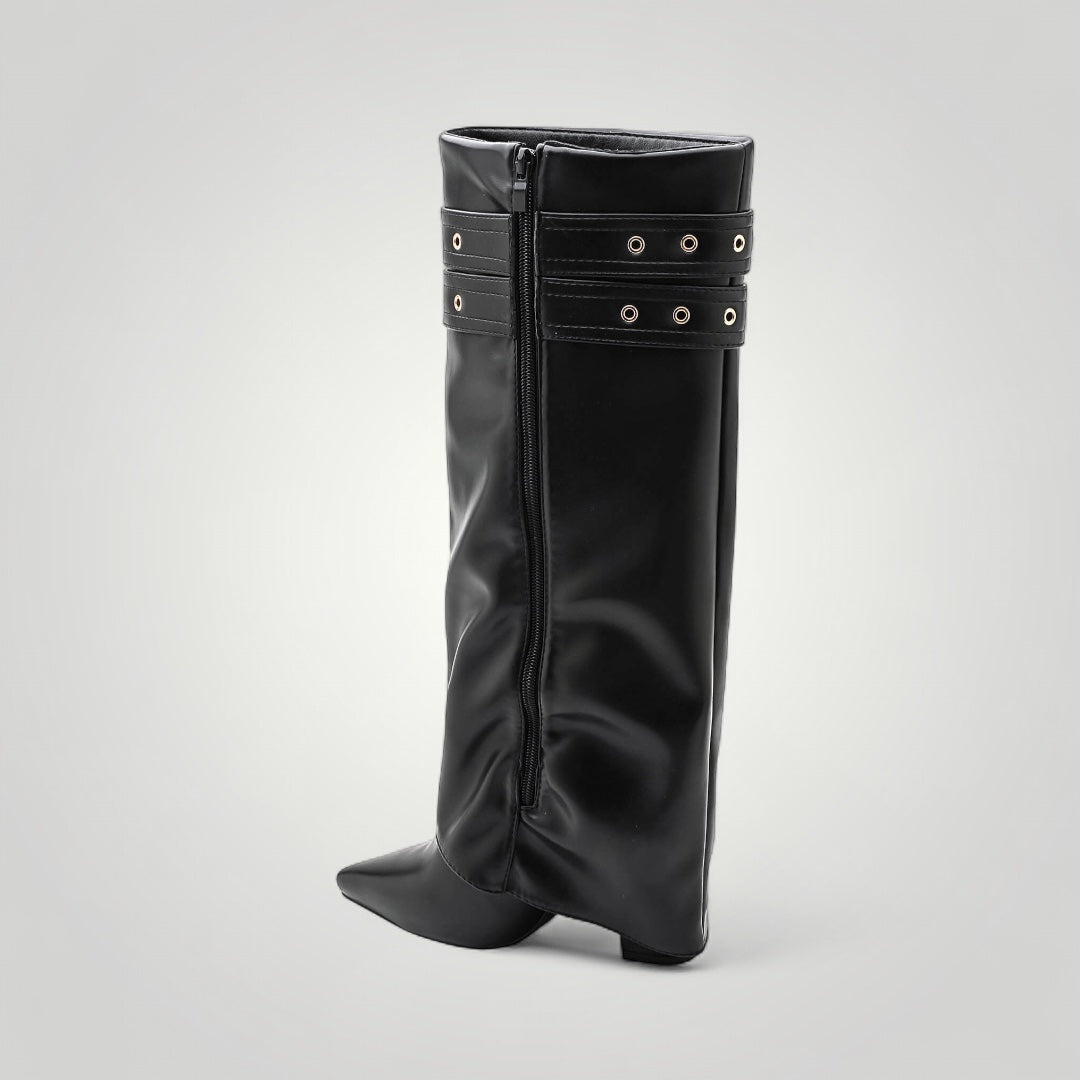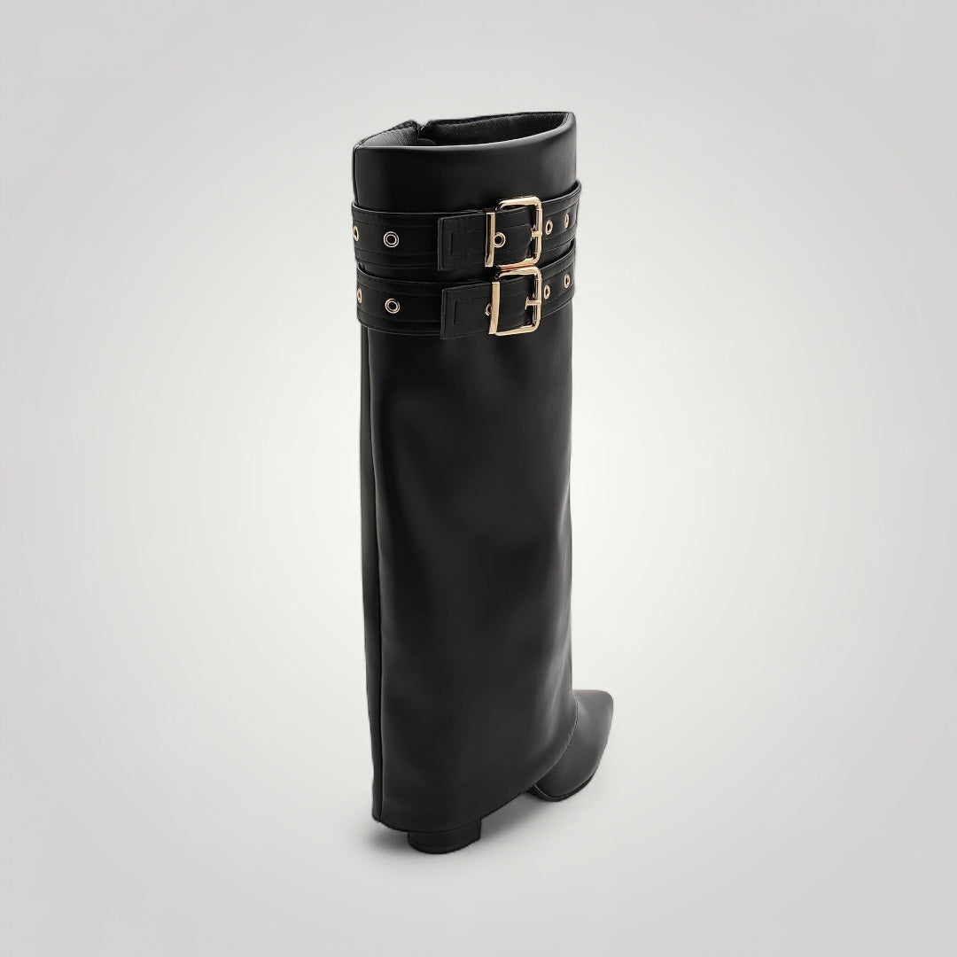 High boots with double buckle adjustment and gaiter-style cover. Side zipper and gold-tone details. Made of high-quality faux leather.