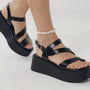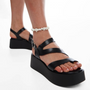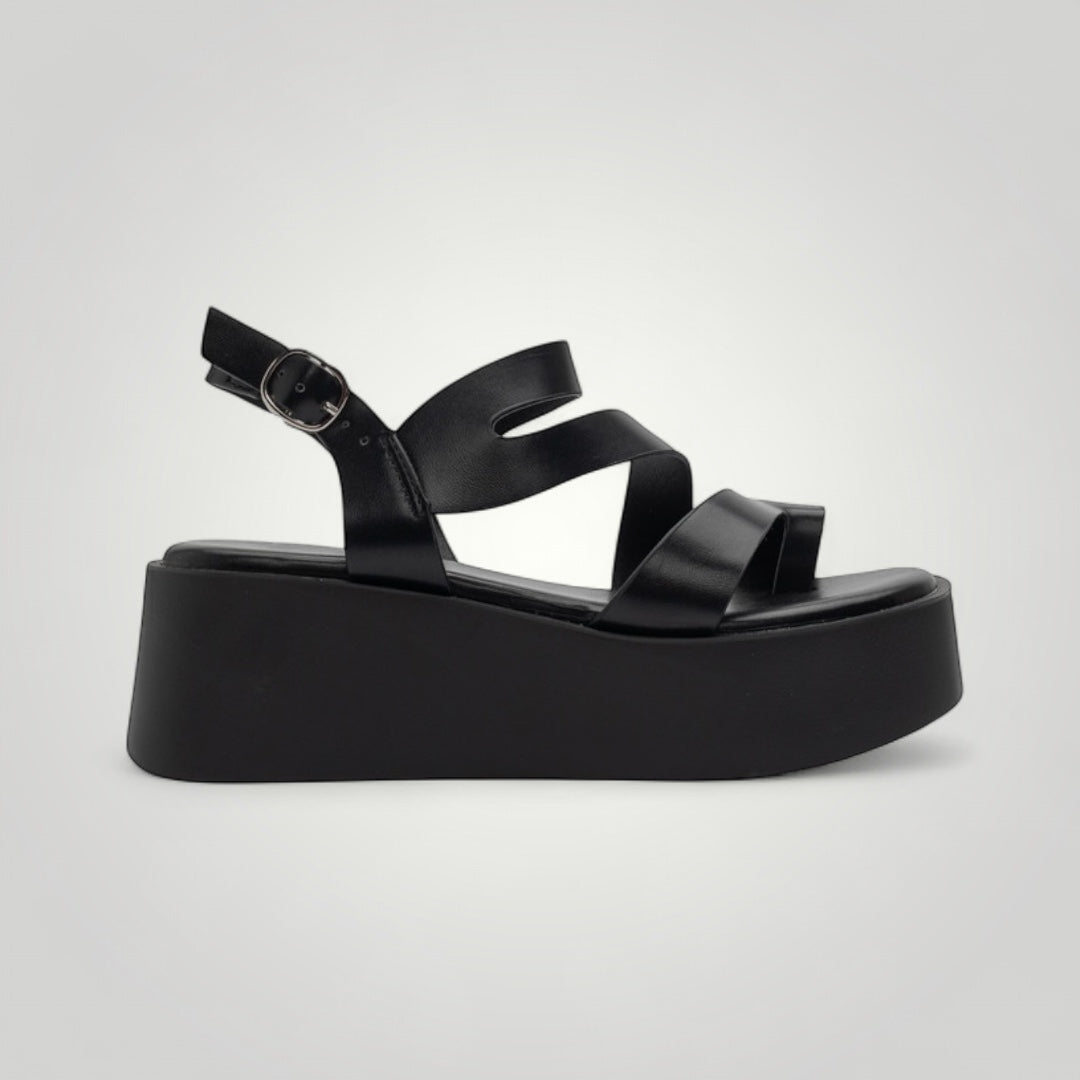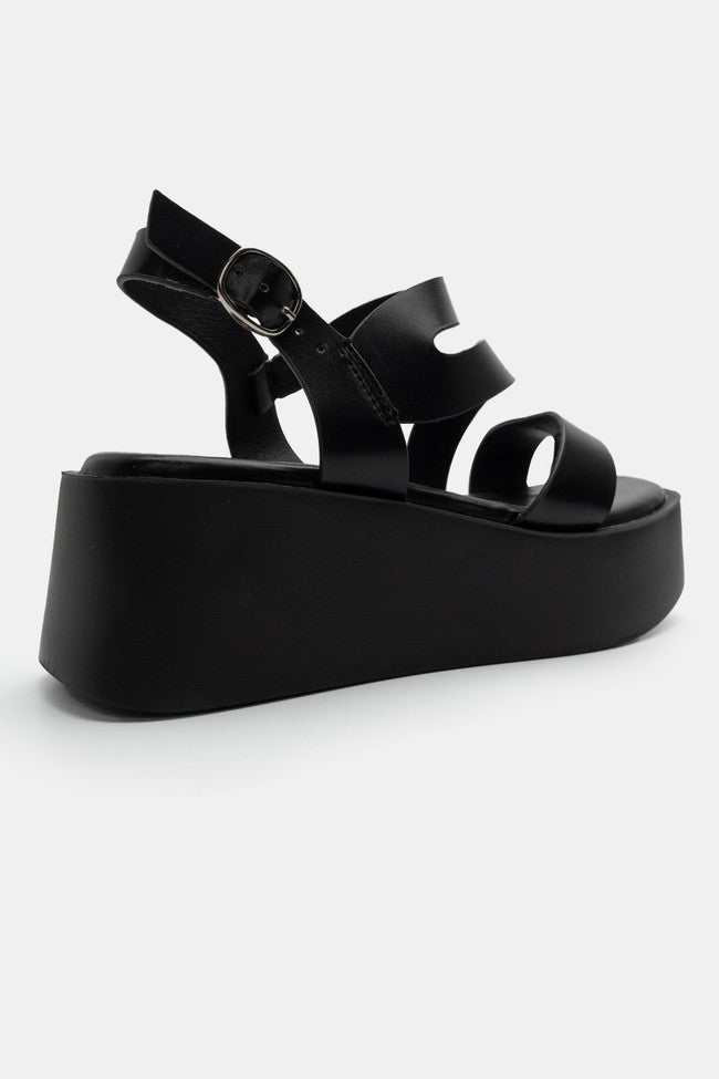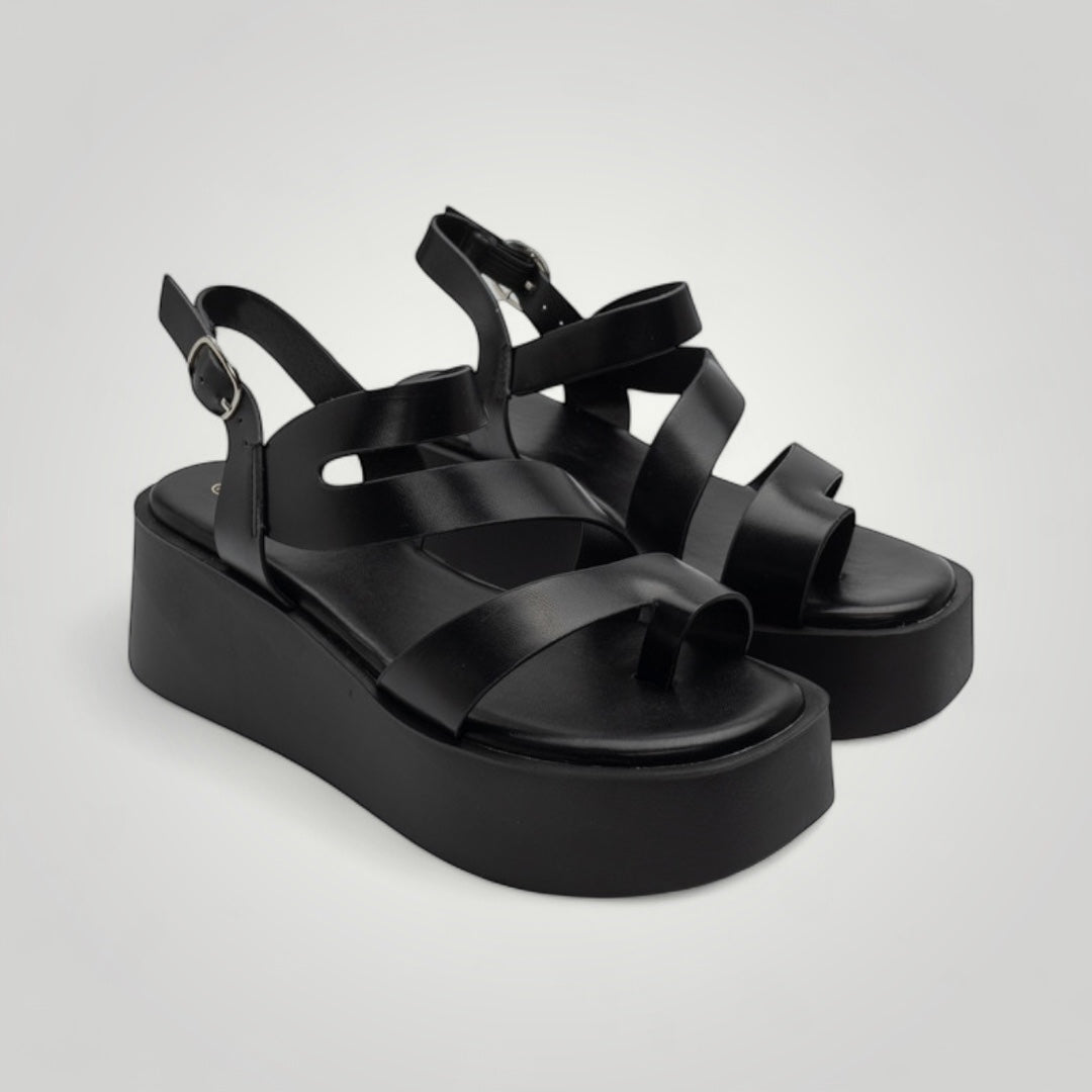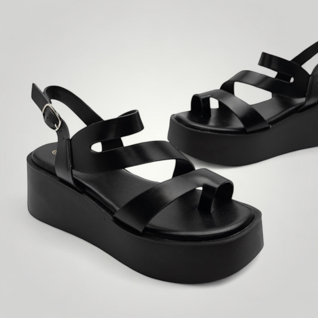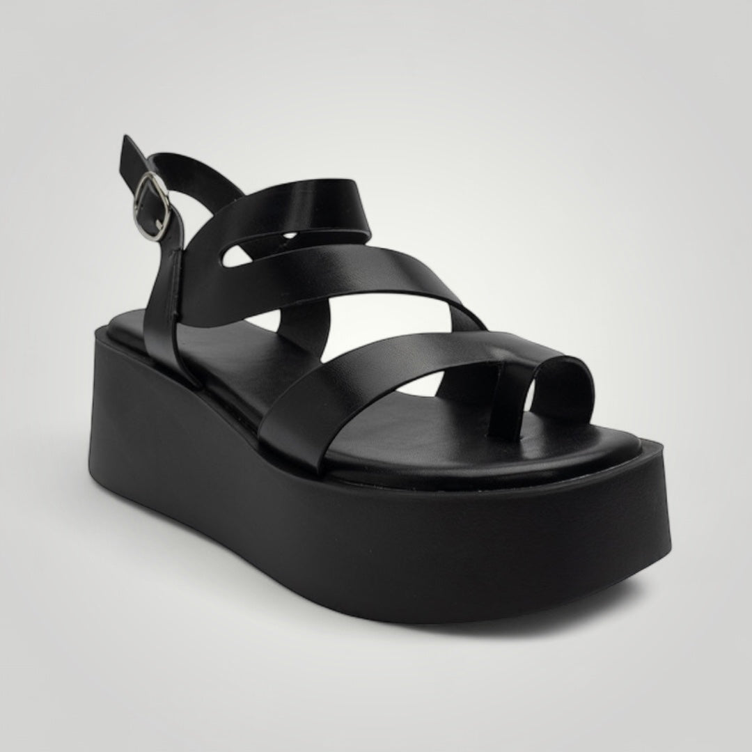 Sandali con piattaforma di colore nero, molto comodi e leggeri, con chiusura a fibbia, suola imbottita e separatore per le dita.