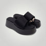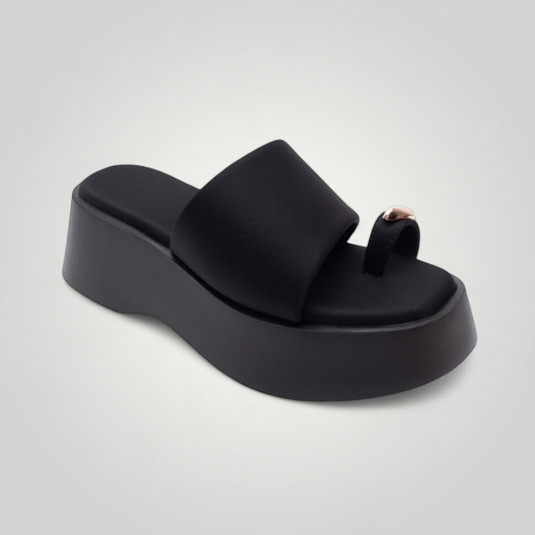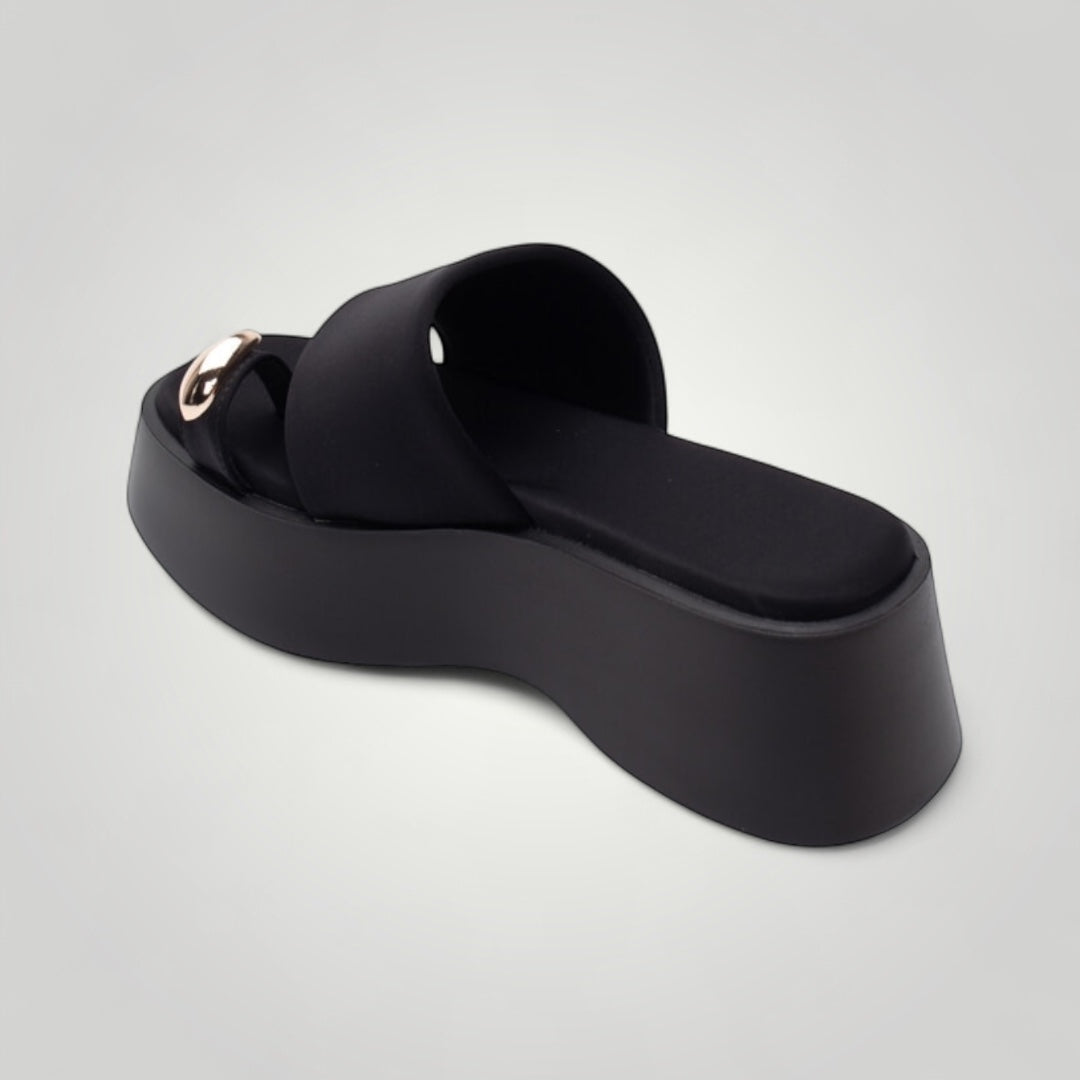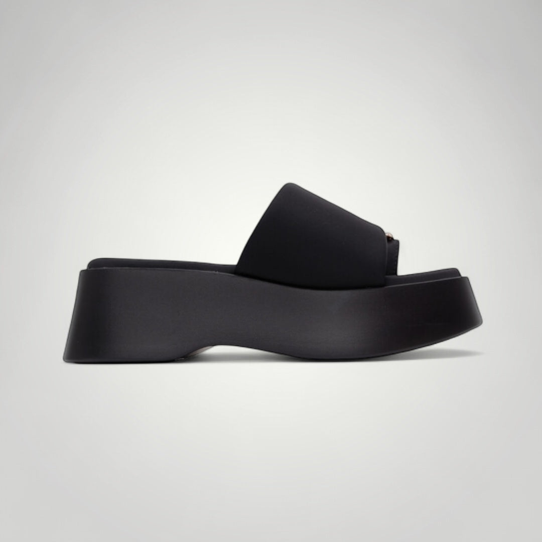 Sandali con zeppa, molto comodi e molto leggeri. Anello divisore per dito con dettaglio dorato. Materiale tipo neoprene. Design minimalista e moderno.
