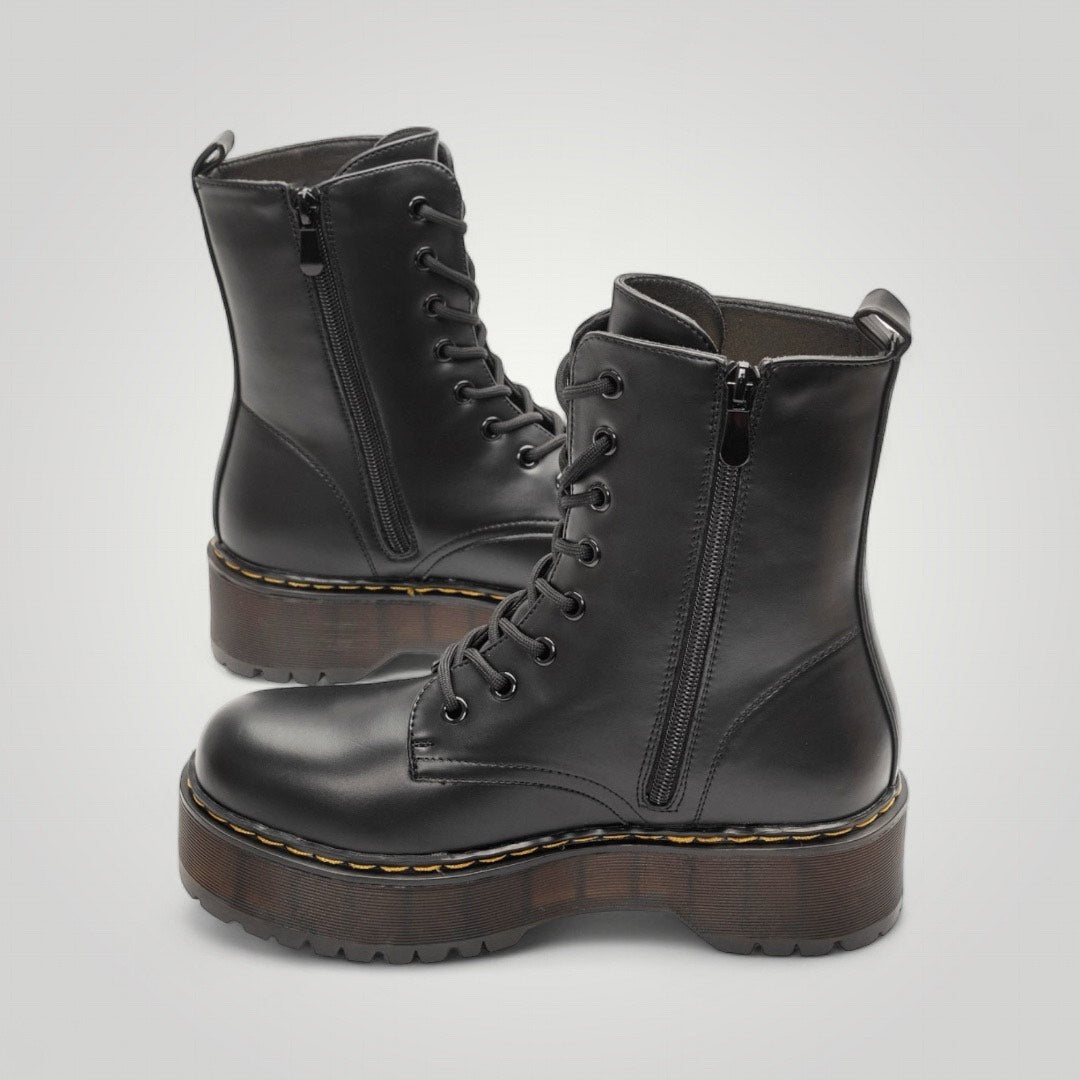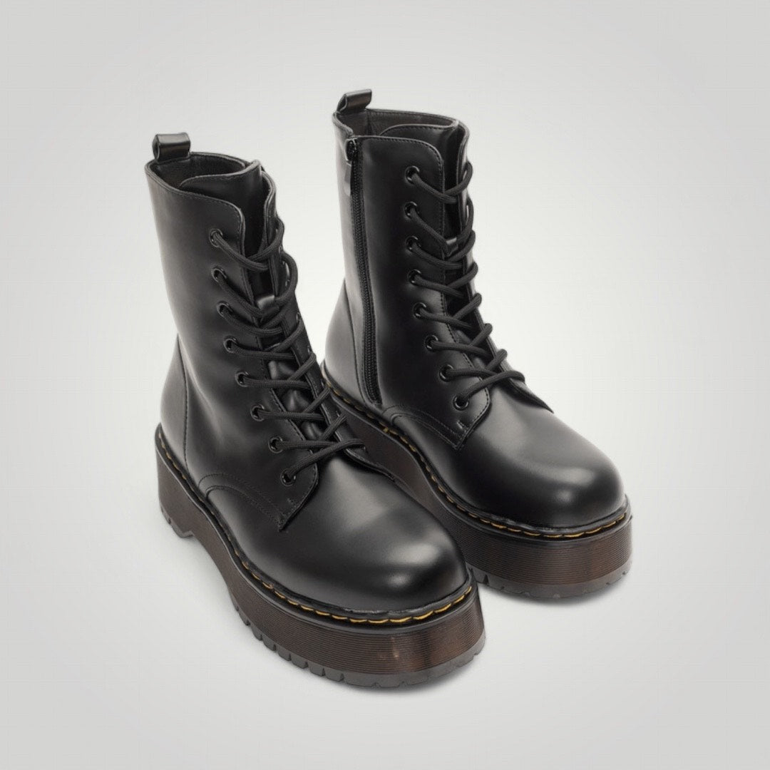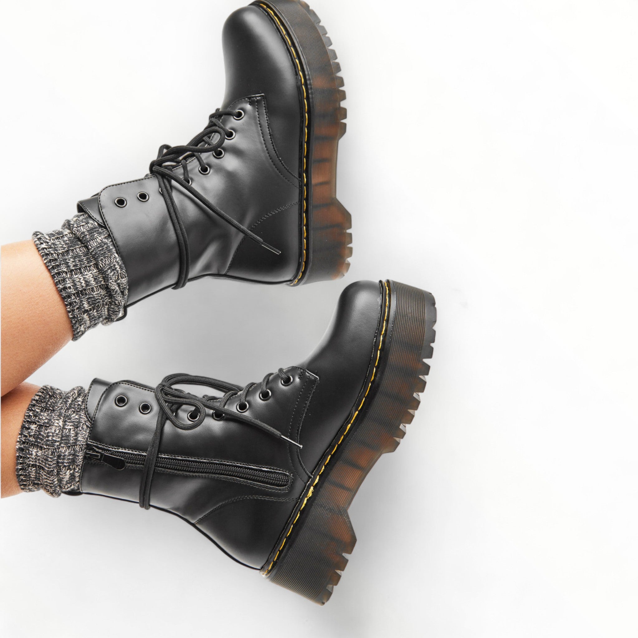 De perfecte combinatie om deze seizoen te stralen. Ontworpen met veters, een zijrits en een platform voor een verfijnde look, de dikke zool met platform voegt hoogte toe zonder in te boeten op comfort, terwijl de gevoerde binnenkant en de antislipzool zorgen voor comfort en veiligheid. Laat ze niet aan je voorbijgaan, deze laarzen zijn nooit uit de mode! Gemaakt van hoogwaardig kunstleer.