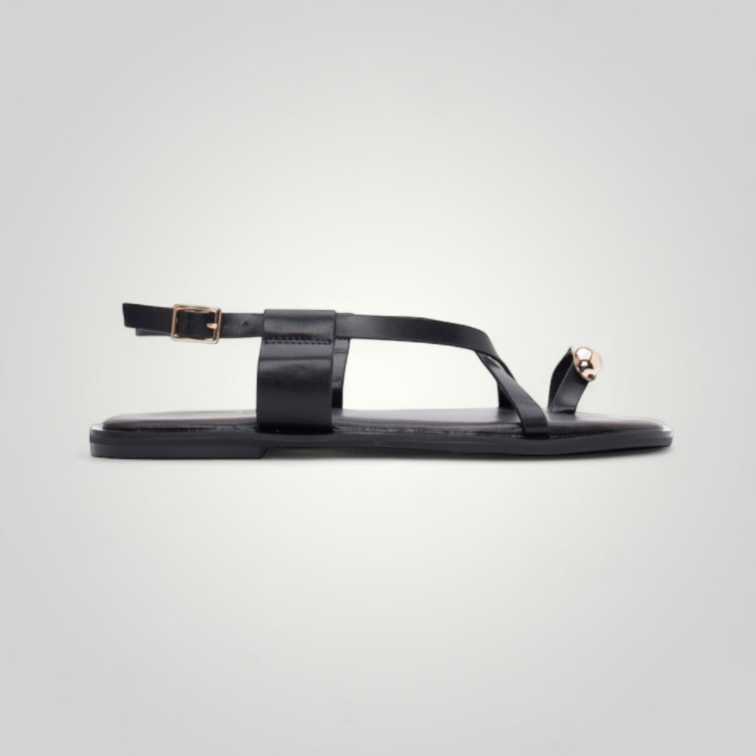 Sandalias planas con detalle de adorno dorado en el dedo. Ajuste de hebilla en la parte trasera. Muy cómodos y ligeros.